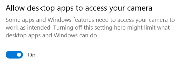 3. Ensure that the settings "Allow apps to access your camera" and "Allow desktop apps to access your camera" are set to On.