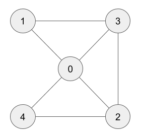 InputAn undirected graph represented as an adjacency list. Each line of input contains one element of the list, which is a space-separated set of numbers. The first number is a vertex index, and all others are the vertices that the current vertex is adjacent to. Vertex indices are continuous integer numbers from 0 to (n - 1), where n is a count of vertices in the graph. So for example: 0 1 2 3 4 1 0 3 2 0 3 4 3 0 1 2 4 0 2 The first row means that the vertex with index 0 is adjacent to (i.e., shares an edge with) the vertices 1, 2, 3, and 4. The second row means that vertex 1 is adjacent to vertices 0 and 3, and so on. See the attachments tab for an image representation of this graph. | ||